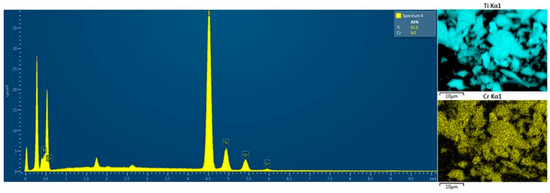 Ti Kα analysis shows even distribution of Ti across the sample. Similarly, Cr Kα analysis shows even spatial distribution of Cr in the sample. There are no localized regions of high or low concentration of Cr in the particles.