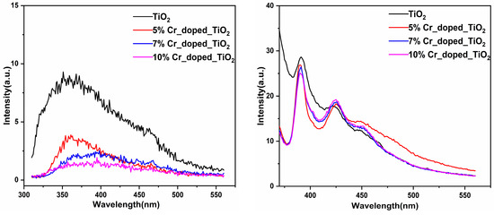PL spectra of undoped and Cr3+(doped)-TiO2 nanocrystals with different dopant concentrations. PL spectra measured with the excitation wavelength at 290 nm (left) and 350 nm (right).