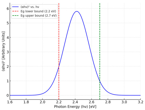 For Cr-doped TiO2, the plot typically reveals a linear region that corresponds to the absorption edge of the material. By extrapolating this linear region to the x-axis (ℎν), the bandgap energy (Eg) can be determined. In this case, the red and green dashed lines on the plot indicate a bandgap range between 2.2 eV and 2.7 eV (see Figure 9), which highlights the narrowing of the bandgap compared to pristine TiO2 due to chromium doping. This narrowing arises from the introduction of localized electronic states within the bandgap by Cr ions, which alter the material’s optical and electronic properties. Such a bandgap range makes Cr-doped TiO2 suitable for visible light absorption, enhancing its potential applications in photocatalysis, solar energy conversion, and other optoelectronic devices.