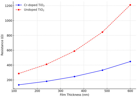 Cr-Doped TiO2 thin films show an increase in resistance with film thickness, following an exponential-like trend. This behavior is attributed to increased electron scattering and a longer electrical pathway in thicker films. The doped Cr ions introduce localized energy states within the bandgap of TiO2, enhancing carrier mobility and reducing resistance compared to undoped films. Doping also improves the inter-grain conductivity by mitigating potential barriers at grain boundaries, which is particularly beneficial in reducing resistance for thinner films. In contrast, for undoped TiO2 thin films, the resistance is significantly higher compared to Cr-doped TiO2 and increases more sharply with thickness. This is due to the intrinsic semiconducting nature of TiO2, characterized by low carrier concentration and high resistivity (see Figure 10). The lack of Cr doping results in minimal charge carrier mobility, making electron transport across the film thickness less efficient. The steeper increase in resistance with thickness reflects the absence of dopant-induced conductivity enhancement.