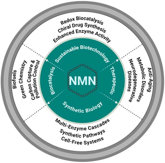 The purpose of this article is to investigate the new function of NMN as a non-natural cofactor and its possible uses in synthetic biology and biocatalysis. Although NMN’s function in NAD+ production has previously been investigated, more recent research has shown how useful it is for boosting enzymatic activity and stability in non-native systems [28]. A thorough summary of the most recent studies on NMN’s incorporation into synthetic metabolic pathways, its effects on enzyme activity, and its potential to enhance biocatalytic processes is what this review seeks to deliver (Figure 1). The review will also highlight the difficulties in employing NMN as a non-natural cofactor and suggest future lines of exploration to fully utilize its potential in creating innovative synthetic biology applications and biocatalytic approaches.
