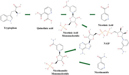 NAD+ is said to be a prevalent redox cofactor that is involved in metabolic regulation, cellular signaling and the production of energy. There are three pathways on which its biosynthesis depends: the de novo pathway, the Preiss–Handler pathway, and the salvage pathway. All these pathways are served by NMN as a central intermediate (Figure 2) [29]. In the case of the de novo pathway, the synthesis of NAD+ occurs via a series of enzymatic actions from tryptophan that produce quinolinic acid, which is lastly converted into NMN. Here, oxidation of tryptophan takes place by indoleamine 2,3-dioxygenase (IDO) or tryptophan 2,3-dioxygenase (TDO) to generate formylkynurenine. Followed by the conversion of kynurenine by 3-hydroxyanthranilate 3,4-dioxygenase and kynureninase into quinolinic acid [30]. Subsequently, nicotinic acid mononucleotide (NAMN) is formed by the catalyzation of the quinolinic acid phosphoribosyltransferase (QPRT) followed by NMN formation by nicotinamide mononucleotide adenylyltransferase (NMNAT)/nicotinic acid [31]. In the biosynthesis of NAD+, the de novo pathway highlights the function of NMN as a substrate as well as in high metabolic demand tissue like the liver [32].