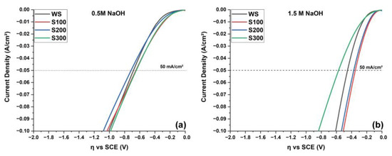 - The S100 and S200 electrodes in 1.5 M NaOH showed a reduction in overpotential caused by an increase in the active area due to an increment in porous size; however, the S300 electrode, with the largest pores, showed a slightly increased overpotential.