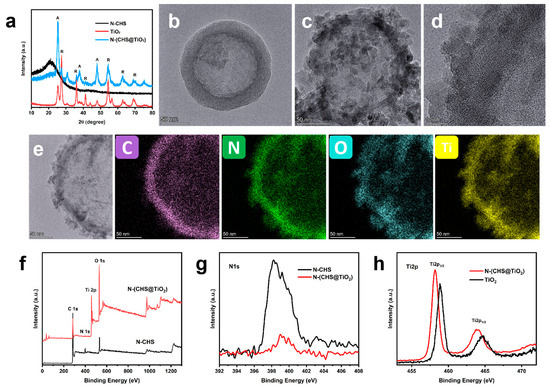 XRD patterns of N-CHS, N-(CHS@TiO2), and TiO2 (A: anatase, R: rutile) (a), TEM image of N-CHS (b) and N-(CHS@TiO2) (c), HRTEM of N-(CHS@TiO2) (d), the corresponding elemental mapping of C, N, O, and Ti of single N-(CHS@TiO2) (e), XPS survey spectra of N-CHS and N-(CHS@TiO2) (f), high-resolution N1s XPS profile of N-CHS and N-(CHS@TiO2) (g), and high-resolution XPS spectra of Ti for N-(CHS@TiO2) and TiO2 (h).