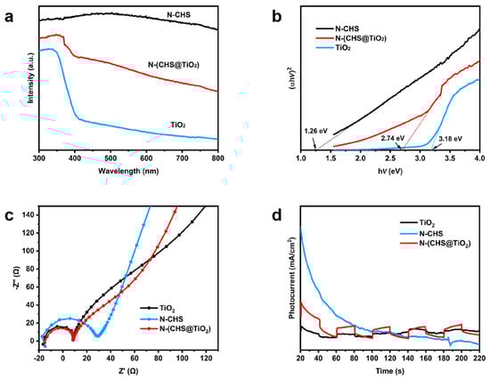 (a) UV-vis DRS of N-CHS, TiO2 and N-(CHS@TiO2); (b) Tauc plots of (αhν)2 versus hν; (c) EIS spectra of TiO2, N-CHS, and N-(CHS@TiO2); and (d) photocurrent of TiO2, N-CHS, and N-(CHS@TiO2).
