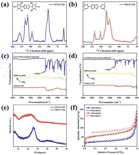 (a,b) The solid-state 13C CPMAS NMR spectra of TPTZ-COF and TBTZ-COF. (c,d) FT-IR spectra of TPTZ-COF and TBTZ-COF. (e) Powder X-ray diffraction profiles of TPTZ-COF and TBTZ-COF. (f) N2 sorption isotherms for TPTZ-COF (blue line) and TBTZ-COF (red line).
