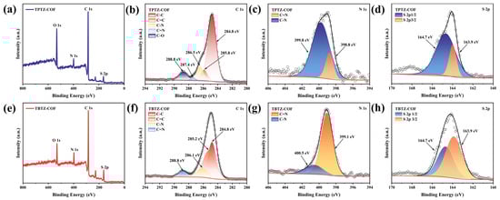 XPS survey spectrum and high-resolution XPS spectra of C 1s, N 1s and S 2p for TPTZ-COF (a–d) and TBTZ-COF (e–h).