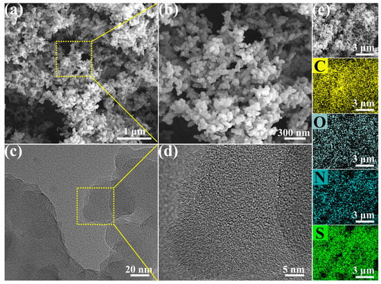 (a,b) SEM images of TBTZ-COF; (c,d) HRTEM images of TBTZ-COF; (e) elemental mapping shows the contents of C, O, N, and S for TBTZ-COF.
