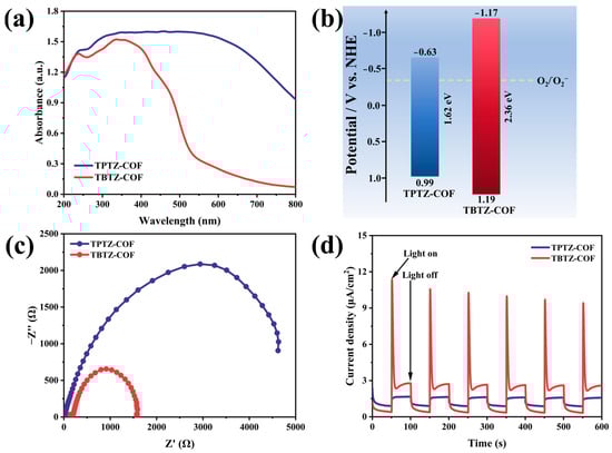 where α, hυ, A, and Eg represent the absorption coefficient, the photon energy, the absorption constant, and the band gap energy, respectively. The Eg of the samples could be evaluated through the intercept of the tangent in the plots of (αhυ)2 vs. photon energy (hυ) because TPTZ-COF and TBTZ-COF were direct bandgap semiconductors [28]. As demonstrated in Figure S6, the slopes of the curves for both samples were positive, indicating the characteristic n-type semiconductors of TPTZ-COF and TBTZ-COF. The Mott–Schottky plots revealed that the values of flat-band potential (Efb) were estimated to be −0.73 V for TPTZ-COF and −1.27 V for TBTZ-COF versus Ag/AgCl (−0.53 V and −1.07 V vs. NHE). Because the bottom of the conduction band (CB) of n-type semiconductors was more negative 0.1 V than the flat-band potential [29], the conduction band of TPTZ-COF and TBTZ-COF were estimated to be −0.63 V and −1.17 V (vs. NHE), respectively. As a result, the relative band gap positions were obtained (Figure 4b). The resistance of the charge transfer performance in TzTz-COFs was probed using EIS. As shown in Figure 4c, TBTZ-COF exhibited a smaller Nyquist semicircle diameter in comparison with TPTZ-COF, suggesting that TBTZ-COF had lower electrochemical impendence and higher electron (e−)/hole (h+) separation efficiency. Furthermore, the visible light response photocurrent of TBTZ-COF was higher than that of TPTZ-COF (Figure 4d), displaying the more effective carrier separation efficiency in TBTZ-COF.