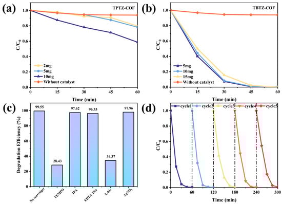 The photocatalytic efficiency of TzTz-COFs was evaluated for the degradation of RhB under visible light irradiation in aqueous solution. In the preliminary experiment, the RhB aqueous solution containing the photocatalyst was stirred continuously for 30 min in a dark environment to achieve adsorption–desorption equilibrium before visible light irradiation (Figure S7). Although the BET surface area of TPTZ-COF (81.7 m2·g−1) was smaller than that of TBTZ-COF (185.61 m2·g−1), the adsorption efficiency of TPTZ-COF was higher than that of TBTZ-COF. A previous study also found that decreasing the BET surface did not affect the adsorption of RhB by the material [30]. When TPTZ-COF was used as the photocatalyst, no matter how the amount of photocatalyst was adjusted, the concentration of RhB decreased only slightly throughout the experiment with visible light irradiation (Figure 6a). This experimental result confirmed that TPTZ-COF was not an efficient photocatalyst for RhB degradation. On the contrary, the TBTZ-COF demonstrated superior photodegradation capabilities compared to the TPTZ-COF. As shown in Figure 6b, the photodegradation efficiency of RhB by TBTZ-COF (0.1 g/L) was 99.76% after 60 min of visible light irradiation. We could observe that the color of the RhB solution changed from pink to colorless during the reaction. Equation (2) was applied to evaluate the degradation efficiency of RhB.
