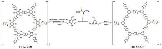 The TPTZ-COF was synthesized via a condensation reaction of 2,4,6-triformylphloroglucinol and dithiooxamide, while the TBTZ-COF was synthesized between 1,3,5-benzenetricarboxaldehyde and dithiooxamide (Scheme 1). Both of them were stable in water and insoluble in common organic solvents. TGA revealed their good thermal stability, and the dramatic decomposition occurred at approximately 400 °C (Figure S1). The weight loss below 300 °C can be attributed to the removal of water or other solvent molecules adsorbed on the sample [20]. Notably, the weight loss rate of TBTZ-COF was lower than that of TPTZ-COF in the temperature range of 300 °C to 800 °C.