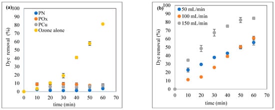 Figure 1. Preliminary tests: (a) individual reagent assessment of wastewater color reaching removal percentages of 3.61 ± 0.57, 7.36 ± 1.5, 7.27 ± 2.2, and 81.20 ± 0.96 for PN, POx, PCu, and ozone alone, respectively; and (b) ozone flow assessment in color removal by obtaining the following decreasing order 150 > 100 > 50 mL/min with 84.60 ± 1.5, 60.94 ± 2.2, and 55.71 ± 3.0, respectively.
