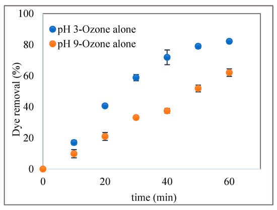 Therefore, tests in wastewater providing ozone were evaluated at pH 3 and 9. Figure 2 shows the results obtained from this treatment and it can be observed that color degradation decays faster at pH 3, suggesting the predominance of direct reactions, where ozone is selective towards the double binding (C=C) of the chromophore group by breaking the dye molecule, and, because of this, the color is degraded in a short time, reaching 58.82 ± 2.01% at 30 min and 82.15 ± 0.82% at 60 min of reaction time, while, at pH 9, there is a slowdown in the removal of the dye indicating the prevalence of indirect reactions where the generation of radical species (mostly HO and H2O2) is promoted, but where the process of color degradation is much slower [54]. Statistically, these data are confirmed with the Student t-test (p < 0.05), for which there is a statistically significant difference between the removal at both pH values.