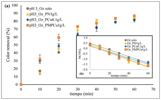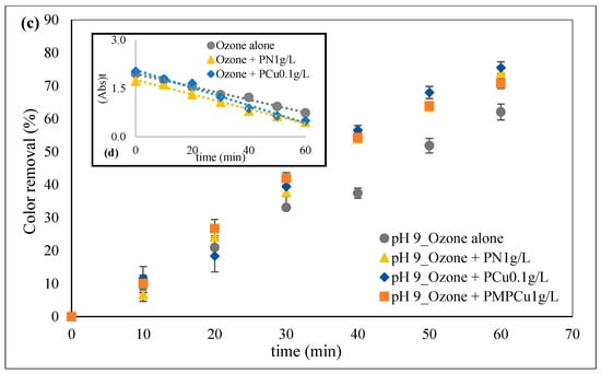 On the other hand, at a basic pH of 9, the degradation is slower, reaching a color removal percentage close to 42% after the first 30 min at the same conditions of mass, ozone flow, and volume of the sample. The coefficient of determination obtained in the linear ratio graph (R2 > 0.98) indicates that the degradation corresponds to a zero-order kinetic model (Table 3), where k for ozone is kO3 = 0.020 min−1; it increases slightly when using PN kPN = 0.023 min−1 and PCu kPCu = 0.027 min−1; according to this model the reaction rate is independent of the concentration of the chemical species present. For the case of PMPCu kPMPCu = 0.021 min−1, it fits the first order kinetic model with a coefficient of determination obtained (R2 > 0.99) where the degradation is affected by some of the chemical species present. Figure 3c shows a slight improvement in terms of color removal efficiency after 60 min with the different catalysts added; however, this is not statistically significant (ANOVA p > 0.05), as it can be seen that the color removal process is slow.