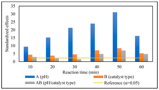 To assess, in a complementary way, the influence of each factor on the discoloration of wastewater, and the contribution of pH, time, and catalyst type, as well as the contribution of factors together, a Pareto diagram was created. According to Figure 4, pH plays a substantial role in color removal; it is important to consider that Fenton and Fenton-like reactions develop better at pH 3.0 [58]; the catalyst also plays an important role, and the parameter interaction bar shows evidence of a synergistic effect throughout the process.