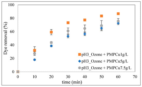 Figure 5. Color removal percentage using different concentrations of catalysts PMPCu (1, 5, and 7.5 g/L) in the ozonation process at pH 3.0 (ANOVA p > 0.05).