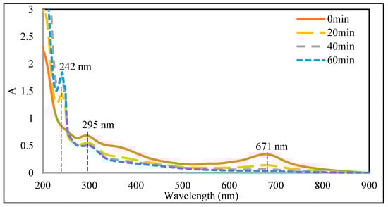 Figure 6. UV–Vis absorption spectra for color removal of ozone-treated textile wastewater at pH 3.0 with 1 g/L of PMPCu.