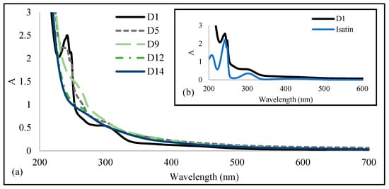 Figure 7 shows the UV–Vis spectrum of the water at the beginning (D1) and end (D14) of the phytoremediation process; the spectrum corresponding to the standard of isatin solution at a concentration of 9 × 10−5 M is also shown (Figure 7b). In Figure 7a, it can be observed that, by day D1, the dye has been degraded by the action of the ozonation/Fenton-like process since the band corresponding to the indigo dye (λmax 671) is no longer observed; it has been replaced by a band located at a maximum absorption of 242 nm which corresponds to the characteristic band of isatin, one of the main by-products of indigo degradation [5,19]. Subsequently, on days D5 to D12 of treatment with M. aquaticum, the band associated with isatin is eliminated, and, at the end, on D14, an absorption band with λmax at 295 nm is presented, which could correspond to organic compounds with simpler molecular structures such as H2C2O4, HCOOH, CH3COOH, CO2, NH4+, NO3, and by-products of isatin degradation according to what has been reported in the literature [5,19,63].