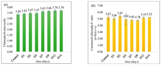 Figure 8a presents the results of the a/b ratio and it can be conclusively observed that no significant differences were found between phytoremediation and control. However, a slight 16% increase in chlorophyll was observed, in response to the stress generated by contaminants present in the WTOFL water, something like what was reported by Chandanshive and collaborators [8]. Another important indicator that estimates the physiological health of the plant is the ratio of Chlorophyll and total carotenoids in Equation (19), where a corresponds to chlorophyll a, b to chlorophyll b, and x + c to total carotenes; normally, this is between 4.2 and 5.0 in sun leaves and/or plants exposed to sun and between 5.5 and 7.0 in plants of shade leaves and/or plants exposed to shade.