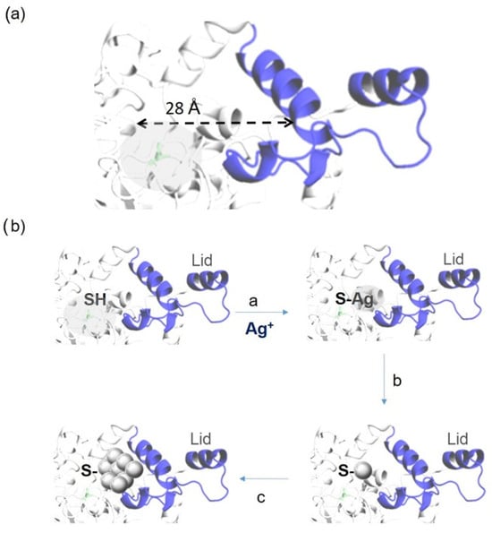 (a) Structure of GTL in open conformation, including the size of the oxyanion hole. The picture was made using Pymol 3.0.3 software with pdb file 2w22. (b) General scheme of the formation of enzyme–AgNPs artificial metalloenzymes: a—enzyme–metal coordination; b—nanoparticle formation; c—nanoparticle growth.