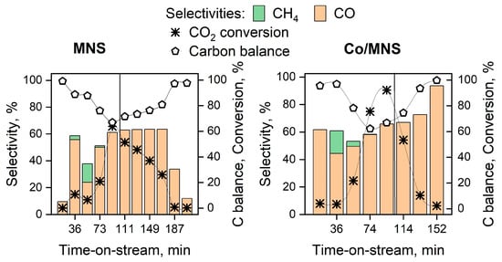 Interestingly, the estimation of the absolute amounts of CO2 converted in each experiment showed that the least effective catalyst NaCo from the point of view of the conversion appeared the most productive in the overall conversion of CO2 (Figure 9). It was caused by the presence of a right tail in the dependence of CO2 conversion on time on stream. The comparison of the obtained results with the available literature helped in the realization that the process of CO2-assisted gasification is quite effective when compared with the literature data and our previous results in CO2 utilization as well as CO production [2,53,54,55].