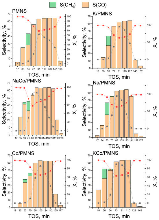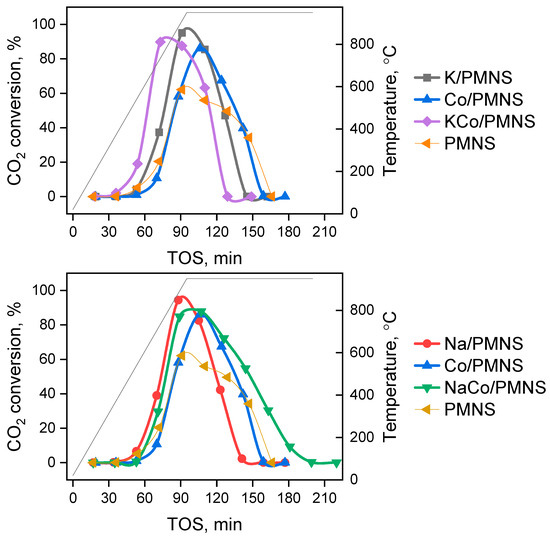 Figure 8 shows a comparison between the Na- and K-containing catalysts’ behaviors. The KCo catalyst showed a synergism in its activity compared to the monometallic samples. The order of the samples in descending order of activity is KCo > K > Co > pure. In the case of the Na-containing samples, the times were longer, and no synergism between Co and Na was observed. In the case of NaCo catalysis, the required time on stream appeared to be longer than that of pure PMNS.