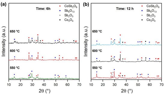 PXRD pattern of CoSb2O6 catalysts calcined 550 °C, 600 °C, and 650 °C for (a) 6 h; (b) 12 h.