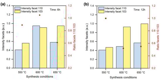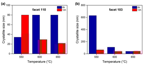 PXRD data, crystallite size comparison between (a) facets 110 and (b) facets 103 of 6 and 12 h samples. Source data are reported in Table S1 and S2.