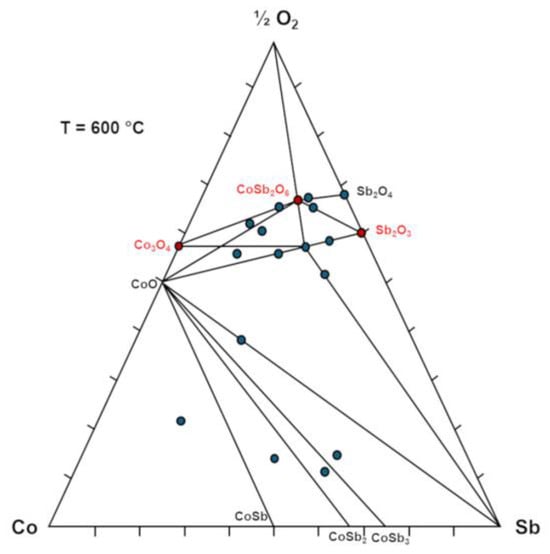 The phase diagram reported at 873 K in Figure 4 demonstrates the stability of three primary phases identified in each sample: CoSb2O6, Co3O4 and, Sb2O3, all of which are inherently stable. A fourth phase, Sb6O13, is not represented in the diagram, as it requires an additional energy of 0.025 eV/atom. Despite this requirement, Sb6O13 can be reasonably considered comparably stable to the other phases.