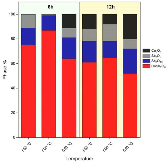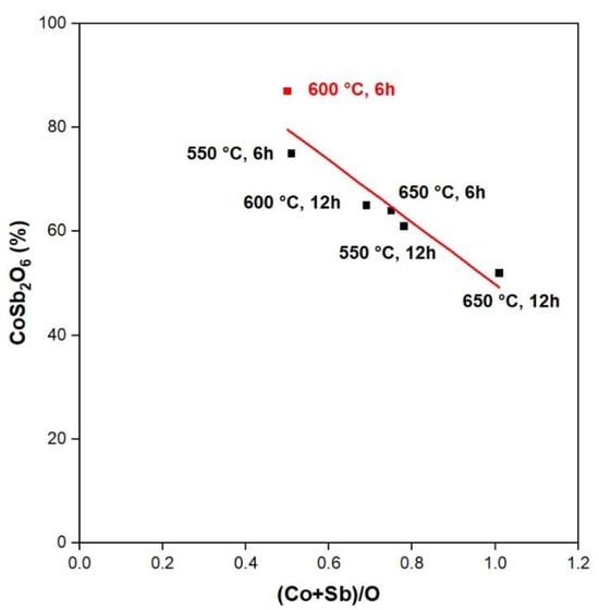 Furthermore, since the calcination step was conducted under static air conditions, it was not possible to control the oxygen content during this stage of the process. The (Co+Sb)/O ratio, calculated against the theoretical value of 0.50, confirmed the highest yield of CoSb2O6 calcined at 600 °C for 6 h, which respects this ratio. The closer the (Co+Sb)/O ratio is to 0.50, the higher the content of CoSb2O6, as displayed in Figure 5. The stability of the multiple phases in the samples and the oxygen content could be considered responsible for the obtained catalysts.