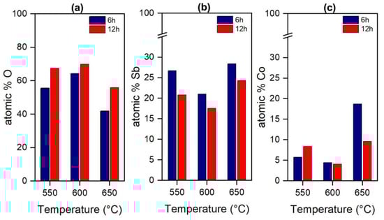 As shown in Figure 7, samples synthesized over 6 and 12 h exhibit distinct trends in atomic percentage composition. Specifically, oxygen content decreases at higher temperatures, while for samples calcined at 600 °C, both Co and Sb contents are observed to be at their lowest levels.
