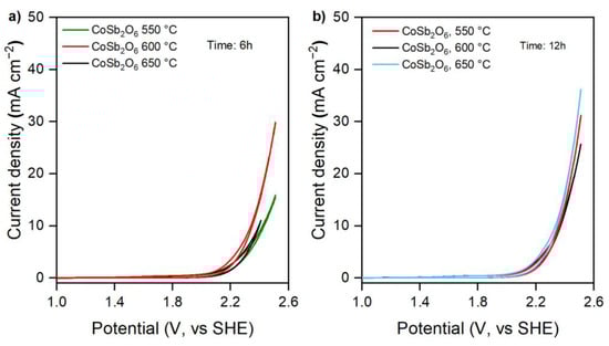 RDE analyses; CP comparison of all different samples of CoSb2O6 synthetized under different temperature conditions for (a) 6 h and (b) 12 h.