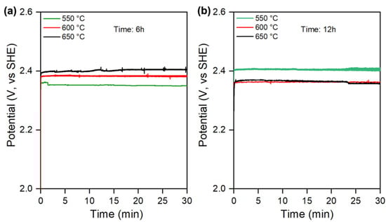 The protocol used to test the catalytic activity of the samples is reported in Section 3.5. Comparing the performances of the materials synthesized for 6 h, see Figure 8, the highest current density was achieved with the catalyst calcined at 600 °C. Both other materials, calcined at 550 °C and 650 °C, showed similar current densities of around 15 mA cm−2. Considering the applied potentials, experimentally obtained from the CP analysis and reported versus the standard hydrogen electrode (SHE), the lowest potential value was shown by the CoSb2O6 at 550 °C for 6 h. Nevertheless, it should be noted that the potential values between the three samples are very close to each other. Noteworthy, the material with the most stable potential is the CoSb2O6 at 600 °C for 6 h (see Figure 9a). Regarding overpotentials and Tafel slopes (see Figure 10 and Table S7), among the 6 h samples, the lowest values come from the CoSb2O6 at 600 °C, with an overpotential of 1098 mV and a Tafel slope of 209 mV dec−1. Among the samples synthesized for 12 h, the activity trend shows an increase in the current density in the following order: CoSb2O6 at 600 °C, CoSb2O6 at 550 °C, and CoSb2O6 at 650 °C. Also for the 12 h samples, there are tiny differences between the potential values recorded with the CP (less than 100 mV, see Figure 9b).