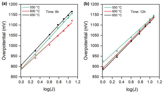 RDE analyses; Tafel plot comparison of all different samples of CoSb2O6 synthetized under different temperature conditions for (a) 6 h and (b) 12 h.