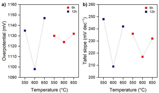 Comparison between calcination conditions with (a) Tafel slopes and (b) overpotentials.