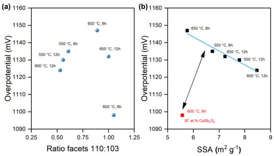 In Figure 12a, the ratio of facets 110:103 of the CoSb2O6 phase is reported as a function of overpotential, while in Figure 12b, the relation between SSA and the overpotential is shown. It is interesting to note that the overpotential is minimized in correspondence to the ratio of 110:103 facets equal to 1.0, which indicates a higher activity of the (101) facet of CoSb2O6. Furthermore, the overpotential decreases when the SSA increases, probably due the increment of the number of active sites exposed. However, the most important parameter is the high content of CoSb2O6, which determines the break of the linear relationship between overpotential and SSA, as displayed by the red dot in Figure 12b, representing the sample at 600 °C for 6 h that contains the higher amount of such a phase.