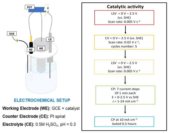 Electrocatalytic tests of the synthesized catalysts were performed in a rotating disk electrode (RDE) system to minimize mass transfer limitations and accurately assess the intrinsic kinetics of each catalyst. As illustrated in Figure 13, the experiments were carried out in a single-chamber cell in a three-electrode configuration. A glassy carbon electrode coated with the catalyst served as the working electrode (WE), an Ag/AgCl (3 M KCl) electrode as the reference electrode (RE), and a platinum wire as the counter electrode (CE). A Biologic VSP-300 multichannel potentiostat (POT) was used to control and measure the electrochemical parameters. The electrolyte consisted of 0.5 M H2SO4 (pH ≈ 0.3) to evaluate the performance and stability of the oxygen evolution reaction (OER) catalysts under highly acidic conditions.
