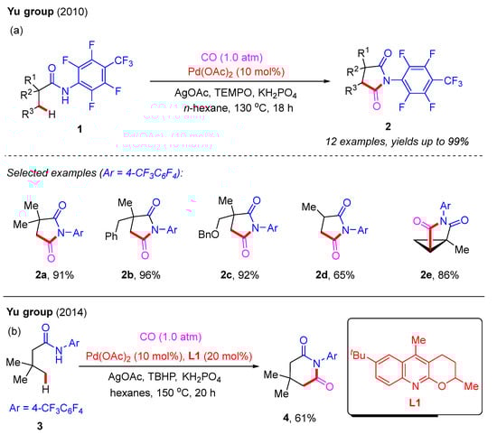 In 2010, the Yu group first developed a novel method to construct five-membered succinimide derivatives 2 from N-aryl alkylamides 1 with CO gas (1 atm) through a Pd(II)-catalyzed β-C(sp3)−H carbonylation reaction (Scheme 1a). In this process, both AgOAc and TEMPO (2,2,6,6-tetramethylpiperidine-1-oxyl) served as crucial oxidants, while the strong electron-withdrawing aryl group, 2,3,5,6-tetrafluoro-4-trifluoromethylphenyl, on the nitrogen atom proved to be the most optimal. The substrate scope investigation indicated that although the presence of quaternary α-carbon atoms in N-arylamides is not necessary, it can greatly increase the yield compared to N-arylamides containing α-hydrogen atoms. Furthermore, this protocol also enables the successful carbonylation of cyclopropane substrates through Pd(II)-catalyzed methylene C(sp3)−H activation [21].