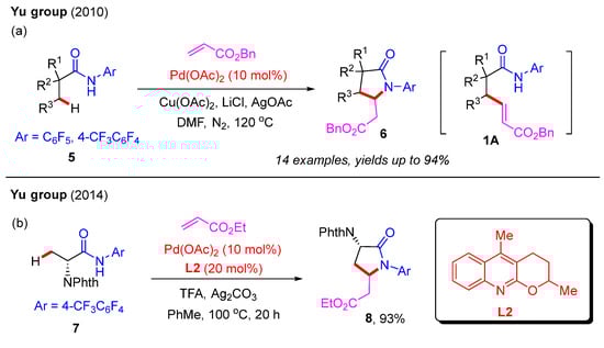 After this, in 2014, the same group reported the Pd(II)-catalyzed cascade β-C(sp3)−H olefination and annulation of the alanine derivative 7 with ethyl acrylate, employing a quinoline-based ligand, L2 (Scheme 2b). In the presence of the ligand L2, the desired product, 8, was isolated in a 93% yield [24]. It should be noted that this quinoline-based ligand, L2, is indispensable for the construction of the γ-lactam derivative 8.