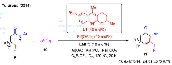 In addition, the Yu group used a quinoline-based ligand, L1, to achieve the Pd(II)-catalyzed cascade γ-C(sp3)−H olefination and annulation of N-aryl alkylamides 9 with alkenes 10 under O2 atmosphere [22]. In this process, the catalytic amount of TEMPO served as a crucial co-oxidant to form the desired δ-lactam products, 11, with good yields. Notably, two substitutions at the β-position were required to prevent β-C(sp3)−H olefination (Scheme 3).