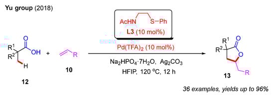 In 2018, the Yu group achieved the Pd(II)-catalyzed cascade β-C(sp3)−H olefination and annulation of free carboxylic acids with alkenes (Scheme 4). In this process, the acetyl-protected aminoethyl phenyl thioether L3 was employed as the key ligand. Alkene substrates bearing different functional groups, including amides, ketones, nitriles, sulphones, and phosphonates, were well tolerated in this reaction, providing the desired γ-lactones with good yields [25].