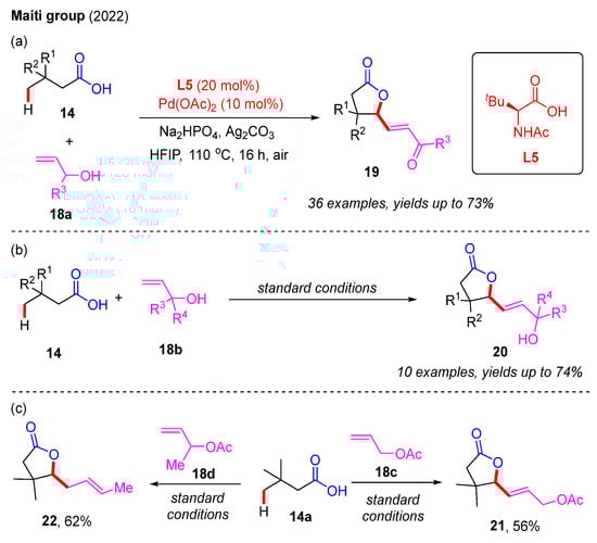 Following this, in 2022, Maiti and co-workers used a similar acetyl-protected amino acid ligand, L5, to achieve the Pd(II)-catalyzed cascade β-C(sp3)−H olefination and annulation of free carboxylic acids with allyl alcohols (Scheme 7). As opposed to their previous work, the cyclization step was achieved though Pd(II)-catalyzed allyl C(sp3)−H activation. When using tertiary allyl alcohols 18b as substrates, the corresponding five-membered lactone products were obtained in good yields. The free OH groups of the tertiary allyl alcohols remained unaffected. However, the use of primary and secondary allyl alcohols 18a provided lactones with α,β-unsaturated ketone and aldehyde groups because the free OH groups in the primary and secondary allyl alcohols were easily oxidized. In addition, using allyl acetate 18c, the desired product 21 was obtained in a 56% yield. The use of but-3-en-2-yl acetate 18d provided the lactone product 22 through a β-acetoxy elimination process [27].