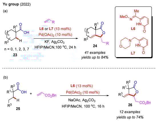 In 2022, the Yu group used 2-pyridone ligands to prepare γ-lactone derivatives through a Pd(II)-catalyzed cascade dehydrogenation–olefination–lactonization reaction. By using novel bidentate oxime ether-2-pyridone L6 or morpholine-2-pyridone L7, different kinds of β-alkylidene-γ-lactones were obtained through the β,γ-dehydrogenation of cyclic carboxylic acids and cascade C(sp2)−H alkenylation with alkenes (Scheme 8a). They found only electron-deficient alkenes to be suitable for the process. Furthermore, acyclic carboxylic acids bearing methylene C(sp3)−H bonds reacted with benzyl acrylate to produce the corresponding γ-lactones in moderate to good yields in the presence of oxime ether-2-pyridone L6 (Scheme 8b) [28].