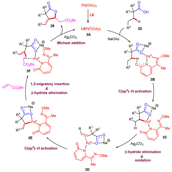 Moreover, a mechanism is proposed and outlined in Scheme 9. The initial coordination of Pd(OAc)2 with oxime ether-2-pyridone L6 generated the Pd(II) catalyst 3A, which reacted with carboxylic acid substrate 25 and the Pd(II) intermediate 3B in the presence of NaOAc. The selective C(sp3)–H activation of 3B provided the Pd(II) intermediate 3C, which then underwent β-hydride elimination and oxidation to form the Pd(II) intermediate 3D. Next, the vinyl palladacycle intermediate 3E was generated through a 2-pyridone ligand-assisted C(sp2)−H activation process. The subsequent benzyl acrylate insertion followed by β-hydride elimination provided the Pd(0) intermediate 3F, which was then converted into the final product 26 via diastereoselective Michael addition.
