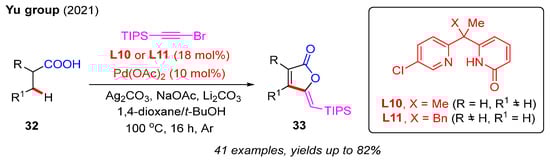 In addition to alkenes, alkynes were also suitable partners. In 2021, Yu and co-workers first reported a Pd(II)-catalyzed cascade α,β-dehydrogenation, C(sp2)−H alkynylation, and cyclization reaction (Scheme 12). Employing crucial 2-pyridone ligands L10 and L11, various aliphatic carboxylic acids, 32, smoothly reacted with (bromoethynyl)triisopropylsilane to yield γ-alkylidene butenolides 33 in moderate to good yields. The use of 2-pyridone ligand L10 produced β-substituted products from simple linear aliphatic carboxylic acids via β-methylene C−H bond activation, while α-substituted products were obtained by using 2-pyridone ligand L11 via β-methyl C−H bond activation from branched aliphatic carboxylic acids [32].