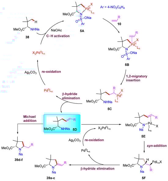 A proposed mechanism is shown in Scheme 14. In the presence of NaOAc, the selective γ-C(sp3)−H bond cleavage of amine substrate 38 with a Pd(II) catalyst produced the five-membered palladacycle intermediate 5A. Next, the Pd(II) intermediate 5A coordinated with the alkene substrate before undergoing a 1,2-migratory insertion to give rise to the Pd(II) intermediate 5C. The intermediate 5C was then further converted into the key intermediate 5D via β-hydride elimination. The in situ-formed Pd(0) species was re-oxidated by Ag2CO3 to produce the Pd(II) catalyst for the next catalytic cycle. Furthermore, the Pd(II)-catalyzed syn-addition of the intermediate 5D with cascade β-hydride elimination generated the vinylated pyrrolidine products 39a–c. Notably, when the alkene substrate contained a nitrile or ketone group (CN, COMe, or COPh), the key intermediate 5D underwent an intramolecular Michael addition to generate the alkylated pyrrolidine products 39d–f.