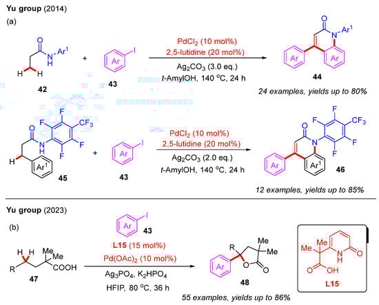 In 2014, the Yu group reported a novel Pd(II)-catalyzed cascade C−H arylation and amidation reaction. The use of N-aryl propionamides 42 and aryl iodides 43 gave rise to diverse 4-aryl-2-quinolinones, 44, with good yields in the presence of the 2,5-lutidine ligand (Scheme 16a). Furthermore, hydrocinnamamides 45 were also suitable for this reaction, providing the desired products 46 with two different aryl groups in satisfactory yields. Mechanistic studies for N-aryl propionamide indicated that the initial β-C(sp3)−H arylation of N-aryl propionamide and aryl iodide produced the hydrocinnamamide intermediate. The subsequent Pd-catalyzed dehydrogenation reaction provided the cinnamamide intermediate, which then underwent a Heck reaction with a second aryl iodide to generate the β-arylated cinnamamide intermediate. Finally, Pd-catalyzed intramolecular C−H amidation produced 4-aryl-2-quinolinones [35].