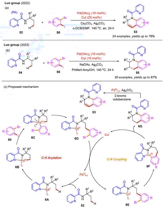 In the following year, they used the same strategy to construct valuable chiral tetrahydroquinoline derivatives from amino acid or alcohol derivatives with o-bromophenyl iodides (Scheme 18b). Notably, the dehydrogenation product could not be detected in the reaction [39]. A proposed mechanism is depicted in Scheme 18c. Initially, the amide substrate 52 coordinated with the Pd(II) catalyst to form the Pd(II)intermediate 6A. The γ-C(sp3)−H activation of 6A generated the Pd(II) intermediate 6B, which then underwent oxidative addition with o-bromophenyl iodide 50 to form the Pd(IV) intermediate 6C. Subsequently, reductive elimination provided the Pd(II)intermediate 6D. Next, the transmetalation of 6D with the Cu(I) catalyst generated the Cu(I) intermediate 6E and a Pd(II) catalyst. The subsequent intramolecular oxidative addition of 6E gave rise to the Cu(III) intermediate 6F, which was further converted into the intermediate 6G and a Cu(I) catalyst via a reductive elimination process. In the presence of the Pd(II) catalyst, Ag2CO3, and o-bromophenyl iodide, the β,γ-dehydrogenation of 6G produced the final product 53.