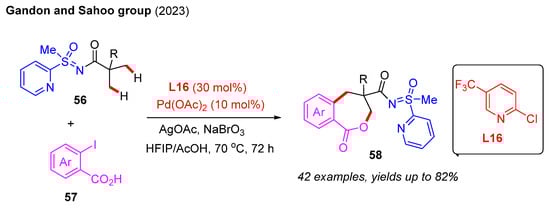 In 2023, Sahoo and co-workers reported the Pd(II)-catalyzed cascade β-C(sp3)−H arylation and lactonization of aliphatic carboxylic acid derivatives 56 and 2-iodobenzoic acids 57 using methyl 2-pyridyl sulfoximine as the bidentate directing group (Scheme 19). Furthermore, 2-chloro-5-trifluoromethylpyridine L16 was found to be an important ligand in this reaction, affording the seven-membered benzofused caprolactones 58 in sufficient yields. Density functional theory (DFT) studies indicated that this reaction is initiated by C(sp3)−H arylation, followed by C(sp3)−H lactonization [40].