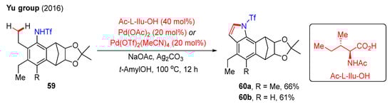 In 2016, the Yu group reported a Pd(II)-catalyzed cascade intramolecular C(sp3)−H amination and dehydrogenation reaction in the presence of an Ac-L-Ilu-OH ligand (Scheme 20). In this reaction, Tf-protected aniline substrates 59 were converted into the desired indole products 60 in 61% and 66% yields. It is worth mentioning that the indole products were essential intermediates for the synthesis of cis-trikentrin A and herbindole B, respectively. Mechanistic studies indicated that the initial C(sp3)−H amination and subsequent oxidative dehydrogenation processes produced the desired product [41].